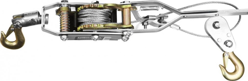 Когда лебедка тянет груз, рукоятка с храповым механизмом или храповой рычаг наматывает трос на катушку, приводя в действие ручную лебедку. Когда лебедка нагружена, храповик останавливает отдачу.