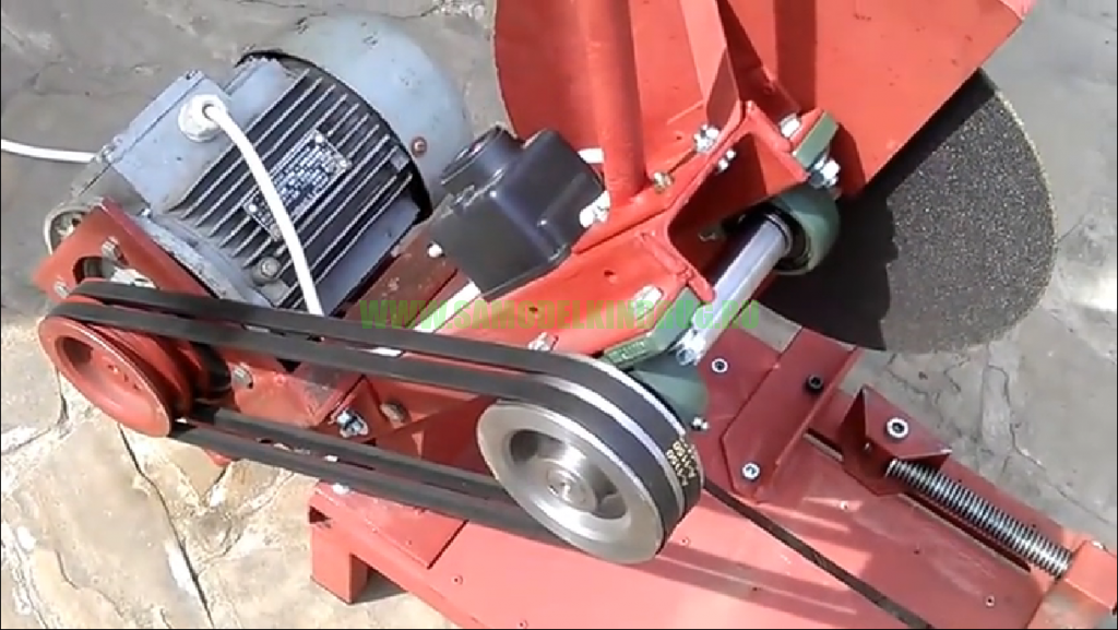 Теперь об электродвигателе для отрезного станка. Предпочтение следует отдать асинхронным двигателям, как более надежным и долговечным. Практика показывает, что для нормальной работы с отрезным диском Ø 400 мм идеально подходит « трёх тысячник» мощностью 2,2 кВт, питаемый от трёхфазной сети. Сгодится и полутора тысячник, но передаточное число ременной передачи необходимо выбрать так, чтобы на валу было около 6000об/мин. В случае питания от однофазной сети, мощность двигателя следует увеличить на 30% и применить рабочий и пусковой конденсаторы.