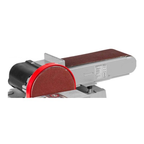 Инструмент предусматривает работу двумя шлифовальными элементами – круг и лента. Станок оснащен угловым упором и регулируемыми рабочими столами – это позволяет обрабатывать заготовки в любой плоскости. На электромагнитном выключателе имеется кнопка экстренного выключения инструмента. Чистоту рабочей области обеспечивает система пылеудаления, а также возможность подключения пылесоса.