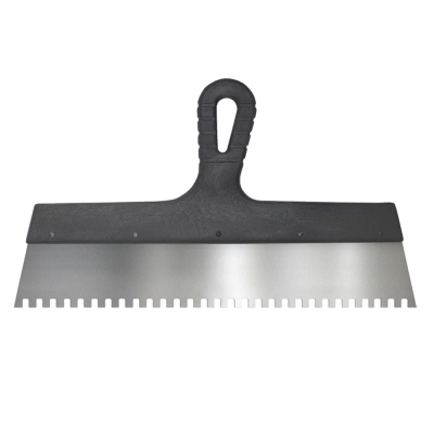 - Пластмасса. Более дешевый вариант, но слишком легкий, поэтому при усилии гребенка может сломаться. А усилие точно нужно, если вы укладываете крупную плитку, которая требует большое количество клея. Самый нежелательный вид шпателя.