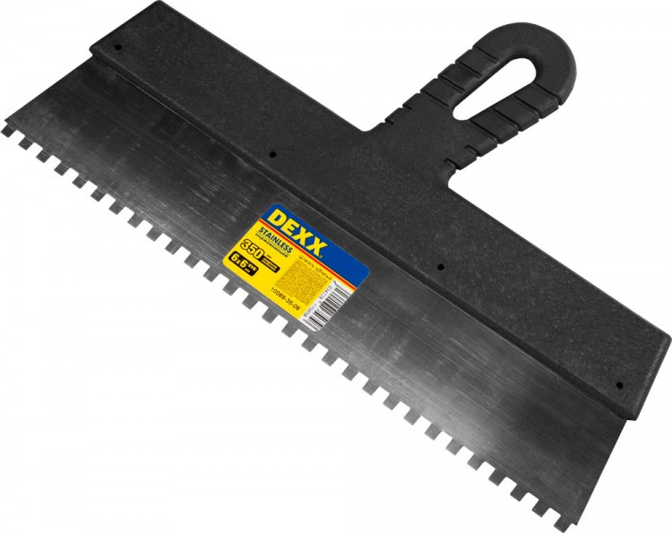 Мастерки с U-образными зубьями обычно имеют только один номер. Это ширина и глубина зубьев . Я использую 10-миллиметровый U-образный шпатель с зубцами в форме полумесяца. Когда вы наносите клей U-образным шпателем, он оставляет полукруглые выступы на основании.