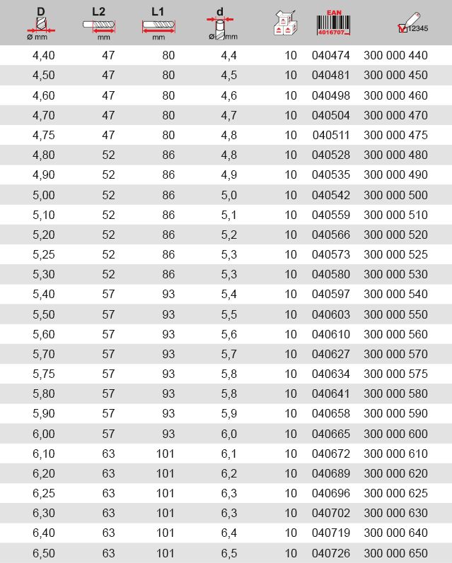 Длина канавки сверл Jobber length и общая длина зависят от диаметра сверла. Эти характеристики см. в таблице ниже.