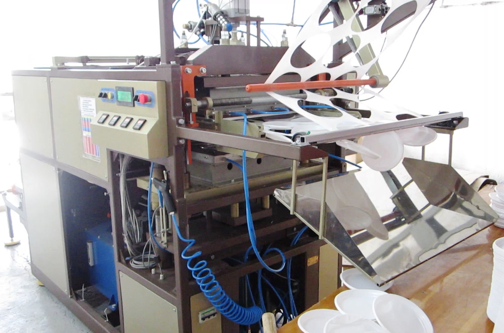 Используется специальное выдувное оборудование для производства изделий с тонкими стенками (одноразовые стаканы, бутылки и прочее). Работает по такой схеме: пластик нагревается и тогда при помощи выдувания формируется изделие.