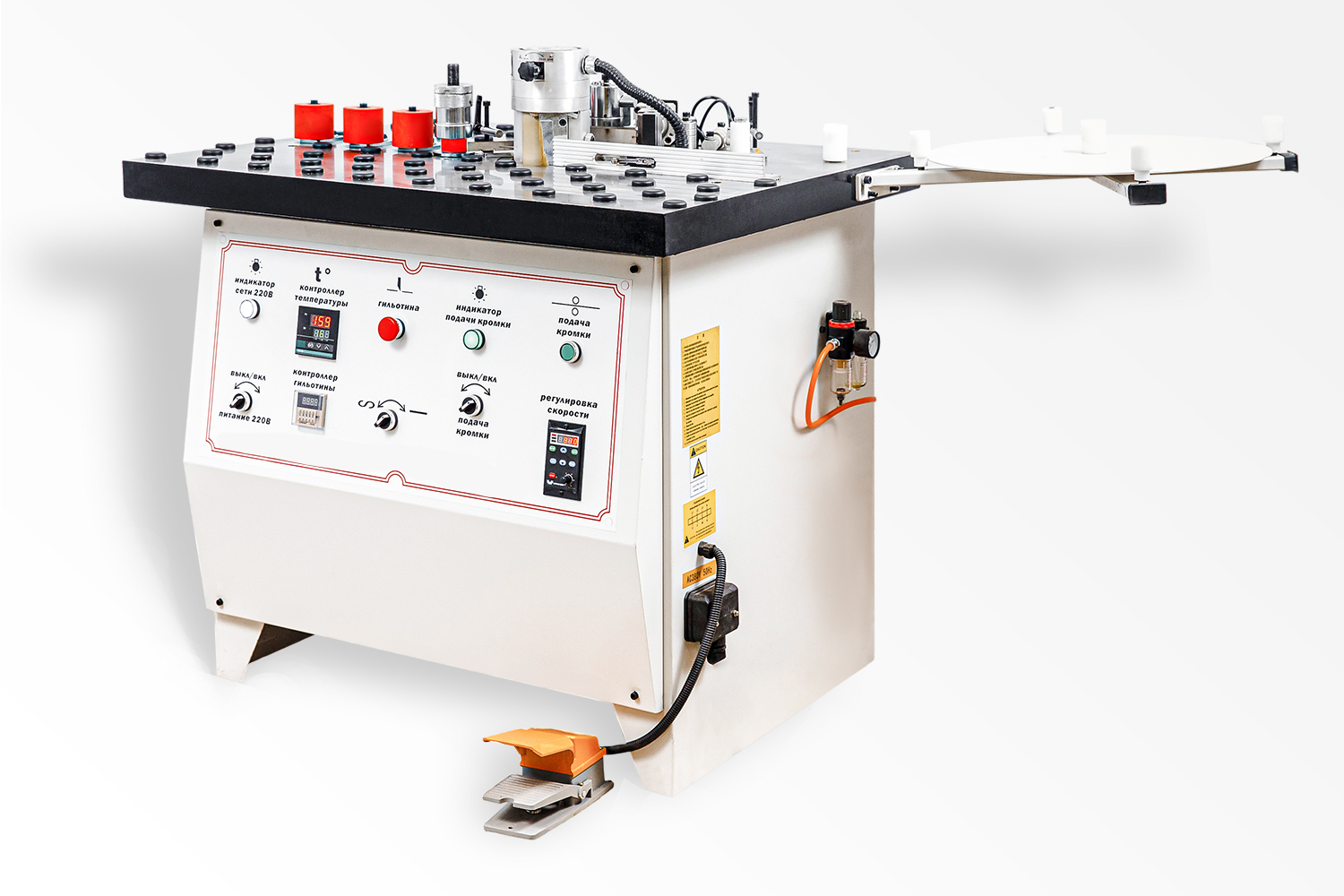 На данном станке предусмотрен автоматический механизм подачи кромочного материала, а также обрезания кромки – гильотины.