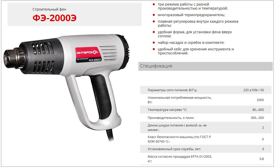- Защита от перегрева. Благодаря этой функции строительный фен отключится сам в случае перегрева. Такое отключение свидетельствует о неисправности, которую необходимо устранить перед дальнейшей работой.