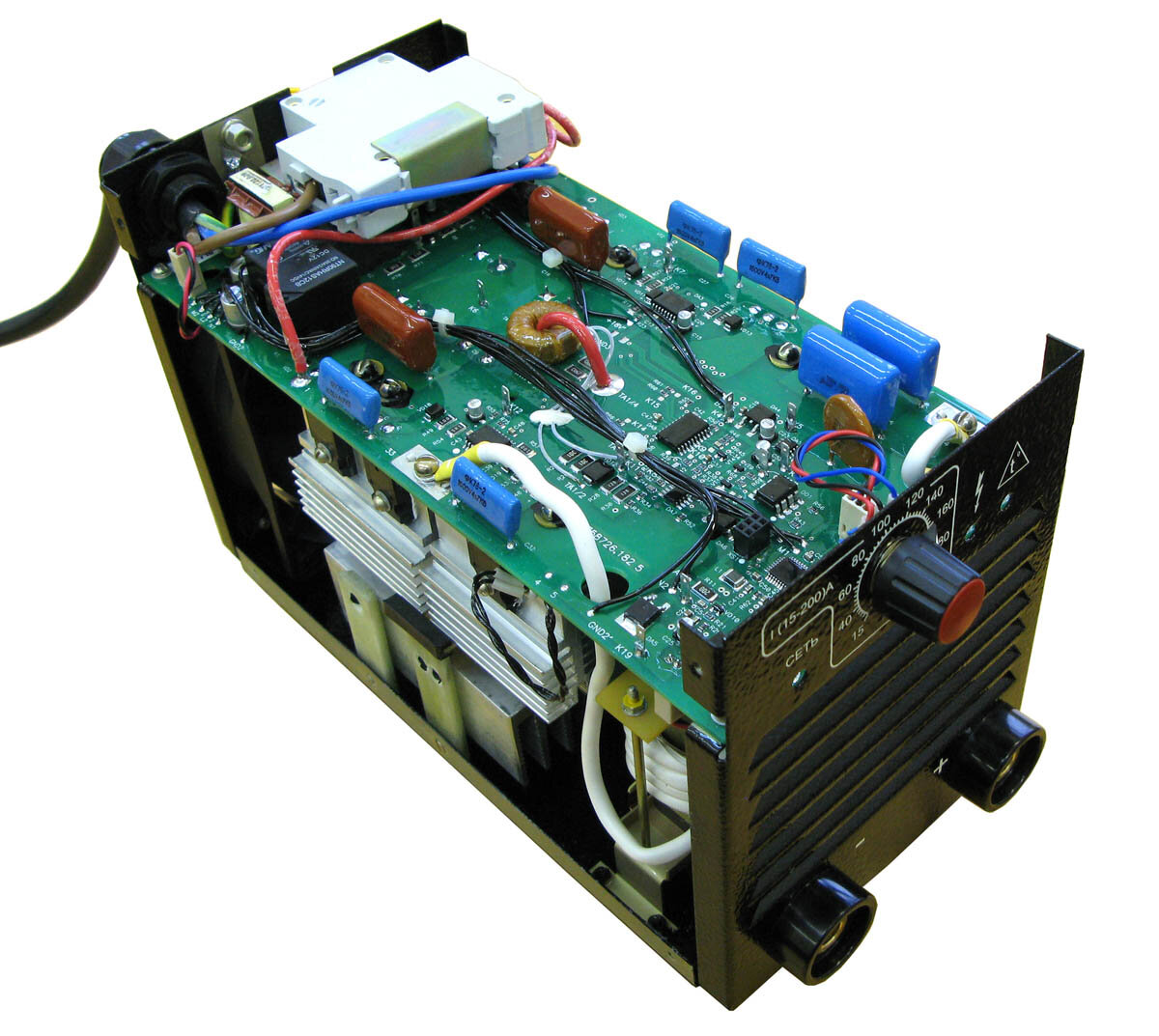 Также выпрямитель имеет защиту от скачков напряжения, реализованную в виде RC-фильтра. На выходе модуля размещаются две медных клеммы, обеспечивающих надежное подключение к ним силового кабеля и кабеля массы. - Плата управления. Управлением всеми операциями инвертора занимается микропроцессор, который получает информацию и контролирует работу аппарата с помощью различных датчиков, расположенных практически во всех узлах агрегата. Благодаря микропроцессорному управлению, подбираются идеальные параметры тока для сварки разного рода металлов. Также электронное управление позволяет экономить электроэнергию за счет подачи точно рассчитанных и дозированных нагрузок.