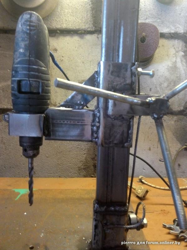 Точность сверлильного процесса на самодельном мини агрегате будет зависеть от качества соединения вертикальной стойки и станины.