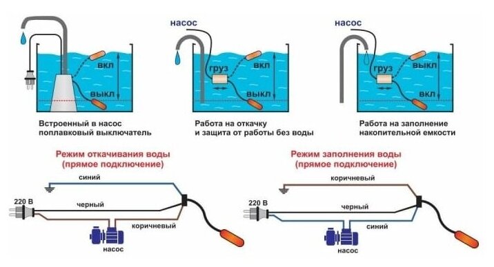 Насос поплавковый может комплектоваться проводами разных цветов. Как правило, черный провод – общий. Благодаря синему проводу происходит отключение оборудования, если уровень воды достигает критической отметки. Коричневый провод отвечает за регулировку насоса, если агрегат используется для заполнения резервуара.
