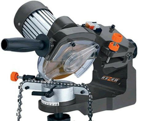 Также стоит отметить, что в его конструкции предусмотрено охлаждение воздухом, чтобы не вызывать перегрева цепи и прибора. А обезопасить оператора при работе позволяет защитный кожух. Также у этого станка имеется шкала для настройки угла заточки. В общем, отличный вариант для бытового использования, который позволит сэкономить деньги на заточке цепей в специализированных сервисах. Стоит он недорого, и окупается в кратчайший срок.