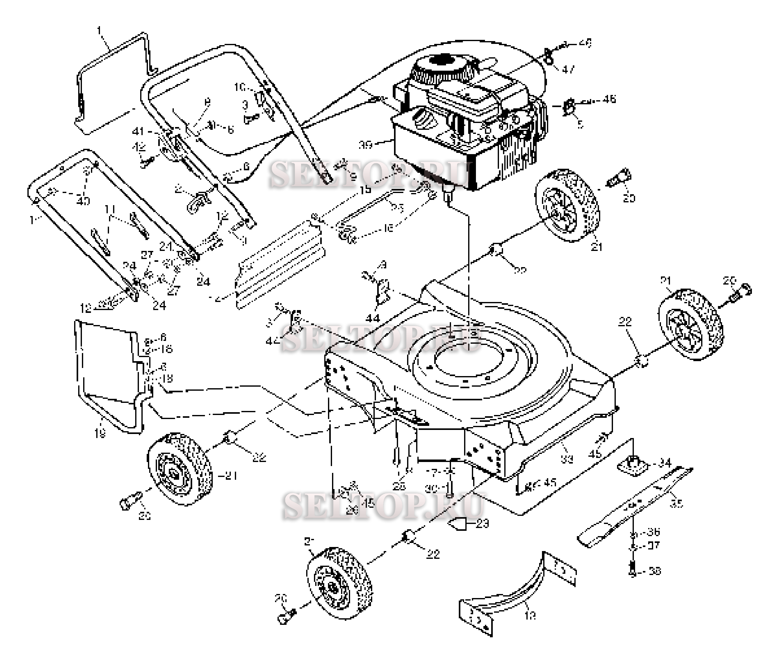 Что же такое газонокосилка? В общих чертах, это одноосная или двухосная тележка, на которой установлен скашивающий блок. Приводиться в действие они могут как мускульной силой, так и при помощи двигателя, который вращает не только колеса тележки, но и режущий инструмент.