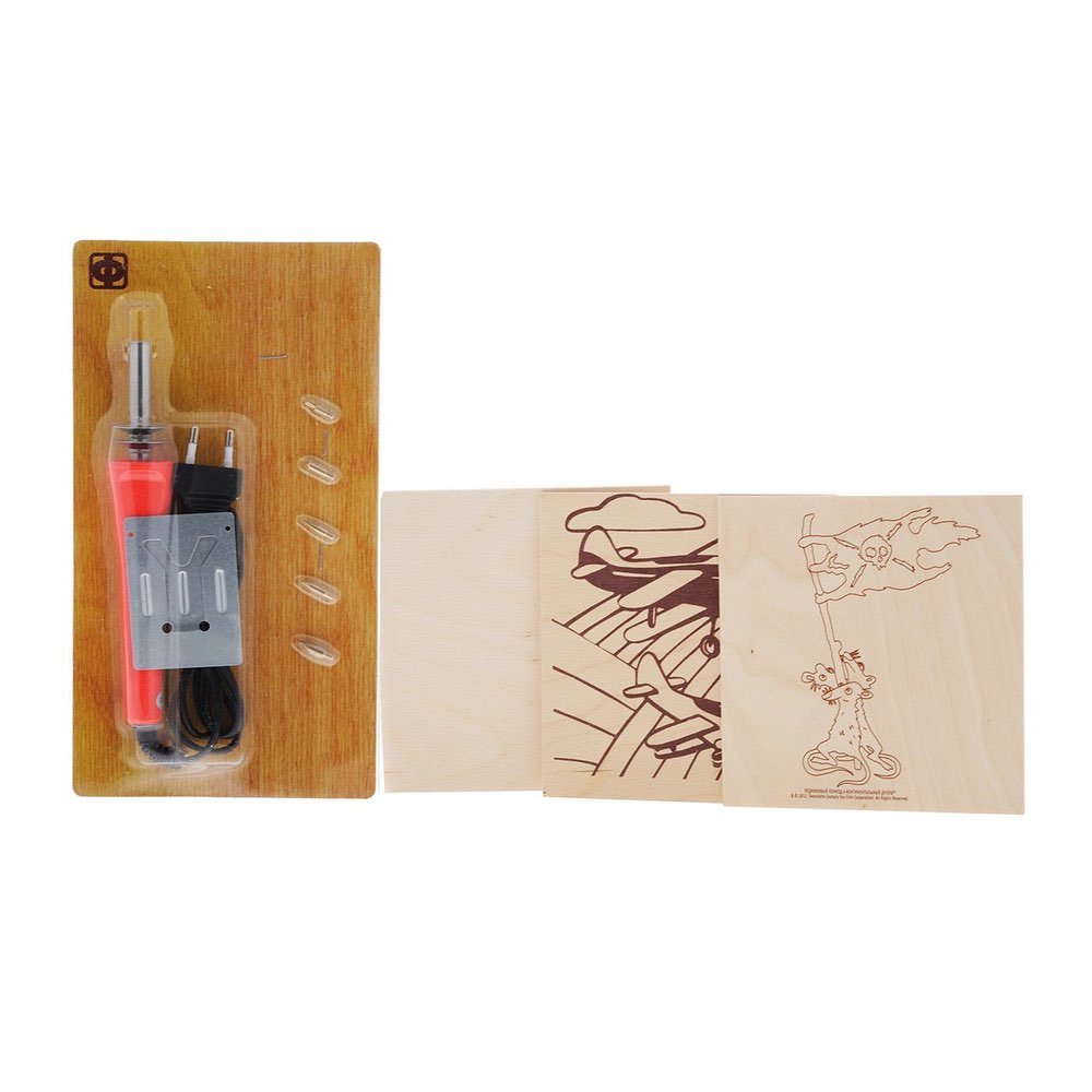 Выжигатель рисует тончайшие линии, с его помощью можно создавать великолепные художественные работы и даже выжигать портреты. Фигурные насадки в комплекте позволят выводить фигурные узоры, переносить самые смелые идеи и яркие фантазии на полотно. Выжигает на любых породах древесины. К комплекту прилагается инструкция, доступно объясняющая принцип работы прибора.