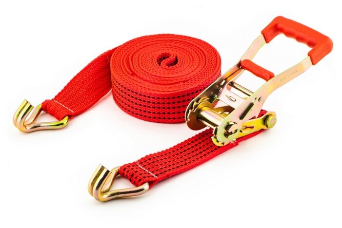 Стяжной ремень состоит из натяжного устройства (храповый механизм или рэтчет), плоской цельнотканой ленты и соединительных компонентов (крюк, оконечное звено). Кольцевое исполнение стяжного ремня подразумевает использование только натяжного механизма и текстильной ленты. Плоская цельнотканая текстильная лента это узкий материал, как правило многослойный, основной функцией которого является способность нести нагрузку; лента характеризуется своей шириной, коэффициентом растяжения (не более 7%) и разрывной нагрузкой. При выборе текстильной ленты необходимо обеспечить трехкратный запас прочности, т.е. разрывная нагрузка текстильной ленты должна быть в 3 раза больше рабочей нагрузки стяжного ремня в целом.Натяжное устройство это механическое устройство, наводящее и поддерживающее растягивающее усилие в сборке для крепления груза.Концевой соединительный компонент это устройство, соединяющее стяжной ремень или натяжной механизм в точке крепления на транспортном средстве или с грузом.При выборе натяжного устройства или концевого элемента стяжного ремня необходимо руководствоваться шириной ленты и обеспечить двукратный запас прочности, т.е. разрывная нагрузка металлических частей стяжного ремня должна быть в 2 раза больше рабочей нагрузки стяжного ремня в целом.В настоящее время наибольшее распространение получил стандартный двойной J-крюк.![]()