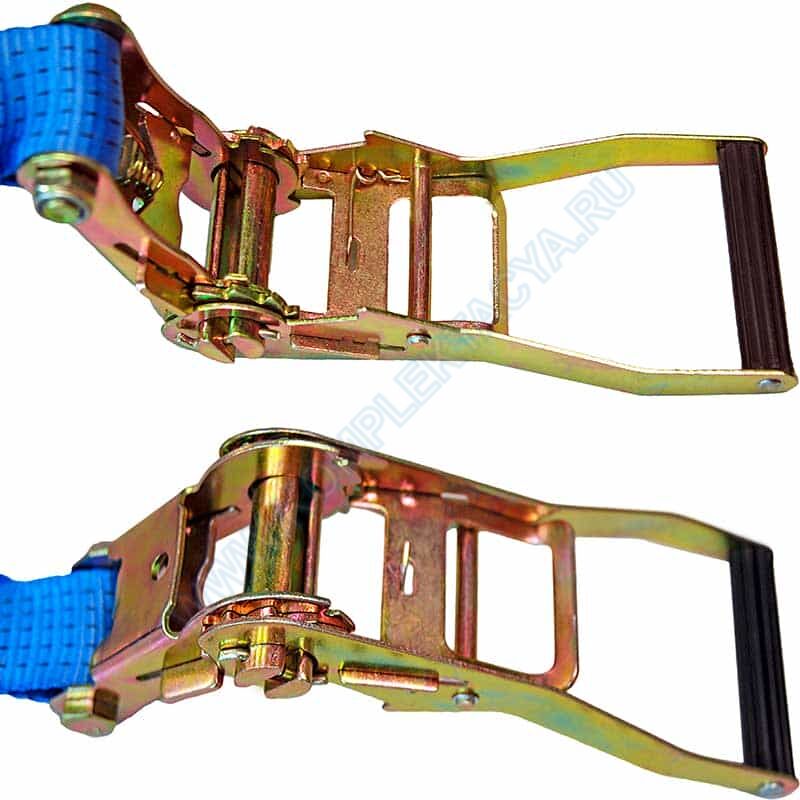 Стяжные ремни с трещоткой или храповым механизмом используют для фиксации грузов. Перед работой нужно провести осмотр оснастки на предмет повреждений. Приспособления нельзя использовать, если обнаружены надрезы на ленте, дефекты швов или металлических элементов конструкции.