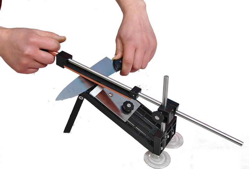 В этом случае жестко фиксируется нож, а наждачный камень имеет возможность перемещаться по обрабатываемой поверхности под постоянным углом.