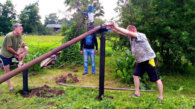 Третий удерживает в вертикальном положении и контролирует после каждого оборота, чтобы опора погружалась строго по вертикальному уровню.