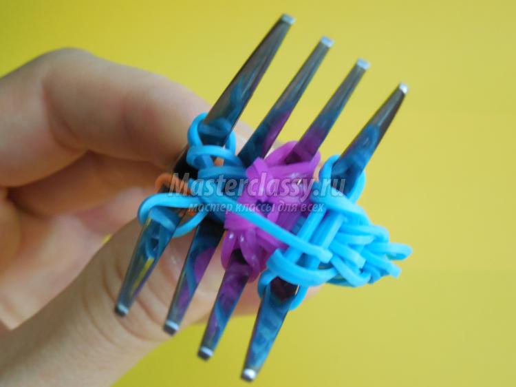То же самое проделываем с противоположной стороны. Последние столбцы соединяем резинкой, закручивая ее в четыре петельки.
