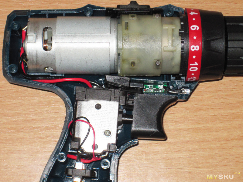 Переключатель на внутренней стороне корпуса инструмента передает питание от перезаряжаемой батареи к двигателю, когда вы нажимаете курок управления скоростью.