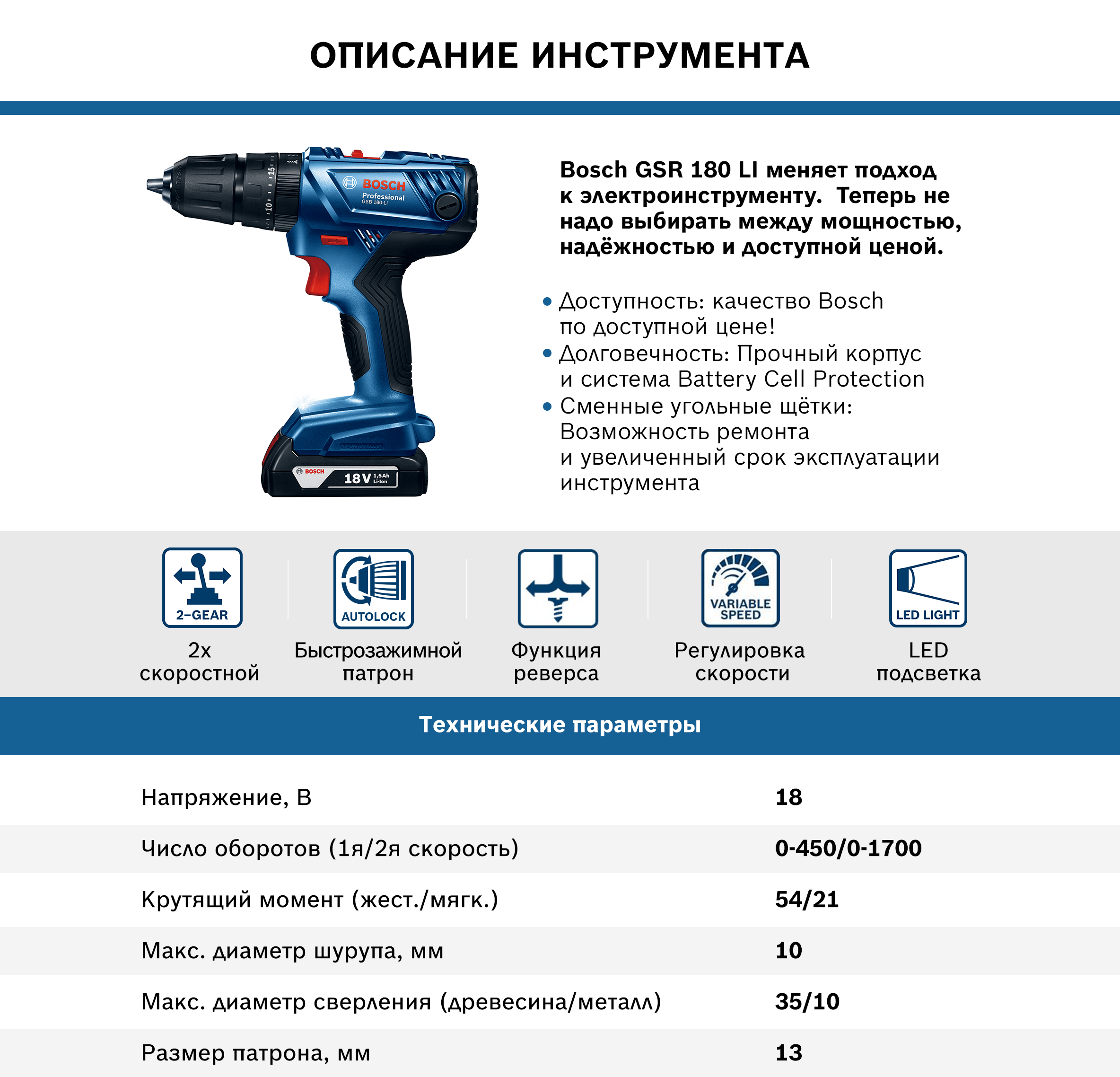 По этому параметру определяется, сможет ли шуруповёрт выполнить поставленную перед ним задачу – например, закрутить нужный вид крепежа. Так, для болта, самореза и шурупа хватит 500 об/мин, для сверления понадобится уже 1200 об/мин; - крутящий момент, значение которого может стать одним из главных ответов на вопрос, на что влияет вольтаж аккумулятора шуруповерта. По этой характеристике можно определить как диаметр, так и длину закручиваемого шурупа или самореза. Для большого крепежа, так же как и для сверления глубоких и широких отверстий, и для твёрдых материалов, требуется и серьёзное значение вращающего момента. Максимальное значение показателя составляет 10–60 Нм.
