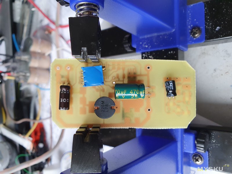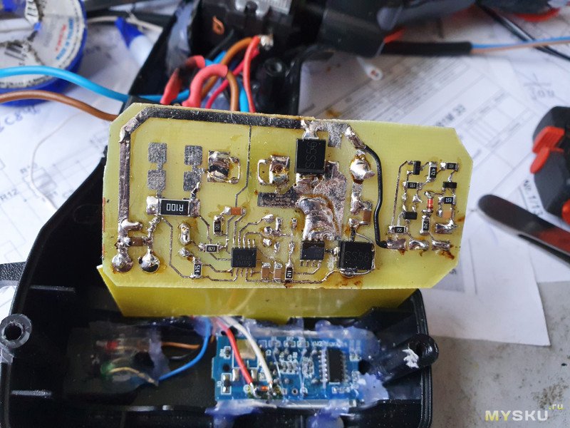 Плата залита лаком и дорожки сразу отлетают. Нахожу еще оборванные R12, R13, R6, два резюка на 0,22 Ом во вторичной цепи. Не могучие, соединены параллельно, стоят по цепи заряжаемого аккумулятора.