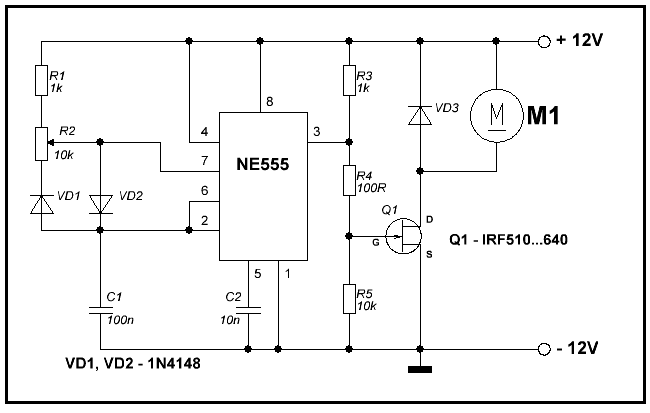 Его назначение в том, чтобы предотвратить разряд времязадающего конденсатора C1 через источник питания и нагрузку – двигатель. Тем самым достигается стабилизация работы частоты ШИМ.